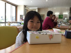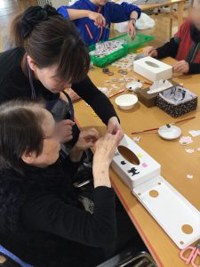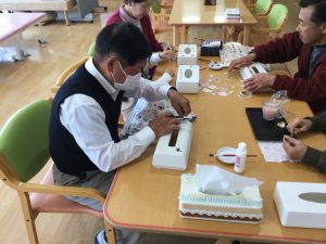 みなさんの集中力がすごい。黙々と作業され、ステキなティッシュケースが完成しました。