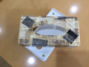 ティッシュケースをデコパージュしたり、シールやマスキングテープを貼ったりして、オリジナルのティッシュケースを作りました。