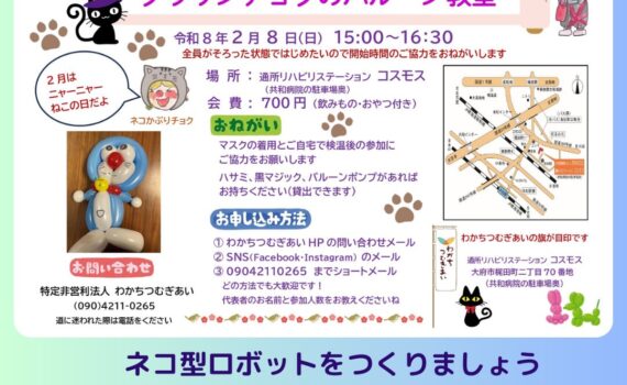 2月は猫の月。。ネコ型ロボット作りましょう。どなた様でもお越しください。#バルーン教室 #おおぶ#共 […] 地域貢献活動 2月は猫の月。。ネコ型ロボット作りましょう。どなた様でもお越しください。#バルーン教室 #おおぶ#共和病院 #クラウンチョク