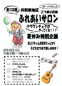 地域貢献 ふれあいサロン by tsumugiai_hirayama|Published 2019-08-01 イベント詳細 日付: 2019-08-18 10:00 – 11:45 カテゴリ: 地域貢献 第133回共和東地区 三ツ屋公民館 ふれあいサロン ※無料・お茶お菓子つき クラウンチョク参加させて頂きます。 おじいちゃんおばあちゃんから子どもたちまで楽しめます! 日時:8月18日(日) 午前10時ー11時45分