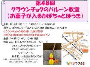バルーン教室 クラウンチョクのバルーン教室 by tsumugiai_hirayama|Published 2019-10-07 イベント詳細 日付: 2019-10-26 14:30 – 16:00 会場: すみれの丘 カテゴリ: バルーン教室 「お菓子が入るかぼちゃとほうき」作ります♪ 場所:通所リハビリセンター「コスモス」大府市梶田町二丁目70番地 日時:令和1年10月26日(土) 14:30~16:00 会費:700円(ワンドリンク+材料費) お申込み:わかちつむぎあいホームページ問い合わせ わかちつむぎあいフェイスブックメッセンジャーまたは、09042110265ショートメールにお名前、人数をお教えください お願い 開始時刻に間に合うようにお越しくださいできれば、はさみ・油性黒マジックをお持ちください。