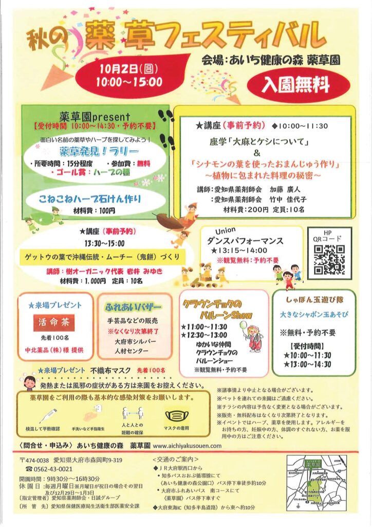 地域貢献 秋の薬草フェスティバルに参加します | 2022.10.02 by tsumugiai_hirayama|Published 2022-09-20 イベント詳細 日付: 2022-10-02 10:00 – 15:00 カテゴリ: 地域貢献 10月2日秋の薬草フェスティバルに参加します。