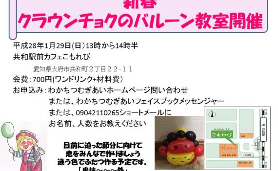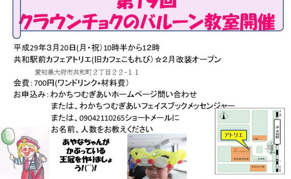 2月11日、おおぶ文化交流の社アローブさんでクラウンチョクのハートフルバルーンプレゼントをさせて頂き […] 平成29年2月11日(日)おおぶ文化交流の社アローブさんでクラウンチョクのハートフルバルーンプレゼント