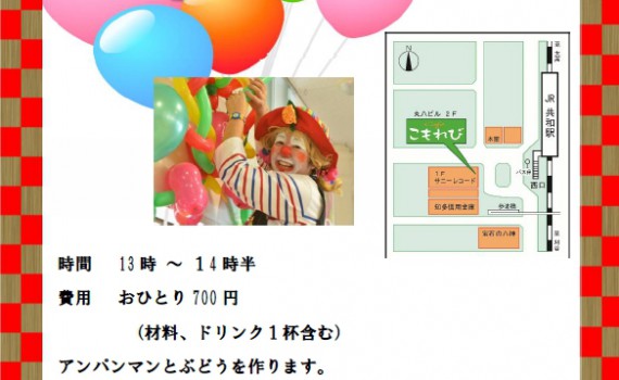 平成28年6月26日、カフェこもれびにてクラウンチョクのバルーン教室を行いました。木に登った猿をみん […] 平成28年6月26日、カフェこもれびにてクラウンチョクのバルーン教室を行いました。木に登った猿をみんなで作りました